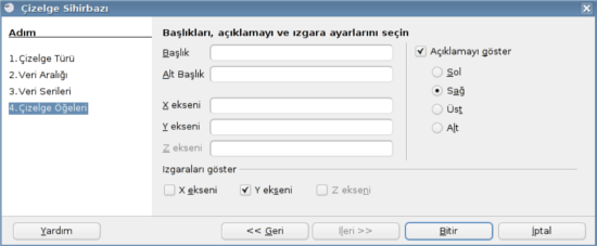 Çizelge sihirbazının Çizelge öğeleri sekmesinden grafiğe başlık verilebilir.