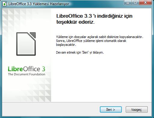 İndirilen kurulum dosyası çalıştırıldığında, LibreOffice kurulum işlemi başlatılmış olur. Kurulum ekranlarının ilkinde kurulum işlemiyle ilgili kısa bir bilgilendirme yer alır.