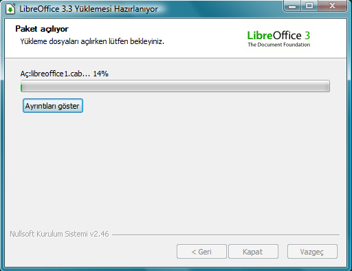 Seçimin ardından "Yükle" butonuna basılmasıyla birlikte LibreOffice'in sisteme kurulumu işlemi başlar.