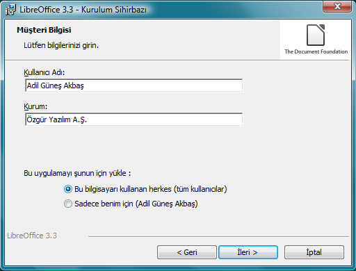 Bir sonraki adım, LibreOffice için kullanıcı bilgilerinin girileceği adımdır.