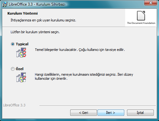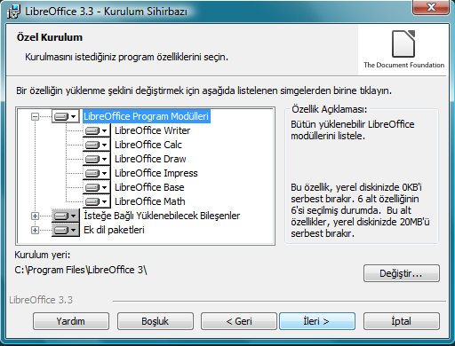 Kurulum tipi kullanıcı tarafından seçilebilir. Öntanımlı kurulum seçeneği işaretli bırakıldığı takdirde tüm LibreOffice uygulamaları sisteme kurulur.