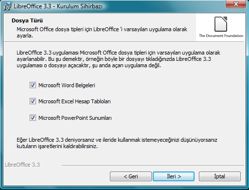 Diskte önceden bulunmakta olan MS Office dosya biçemlerindeki dosyaları bu adımda LibreOffice ile eşleştirerek öntanımlı olarak LibreOffice ile açılmalarını sağlamak mümkündür.