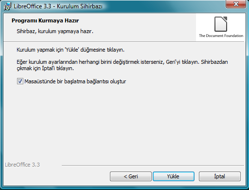 Kurulum işleminin başlamasından önceki son ekranda, masaüstüne bir LibreOffice kısayolu yerleştirmek istenip istenmediği sorulur.
