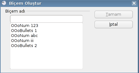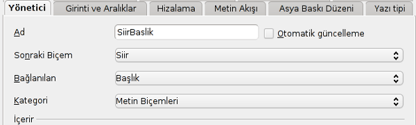 Başlık, metin gövdesi gibi önceden tanımlanmış birçok biçem mevcuttur. Ancak "şiir" gibi farklı bir biçem gerekiyorsa, "Biçemler ve Biçimlendirme" yardımıyla yeni bir biçem oluşturulabilir.