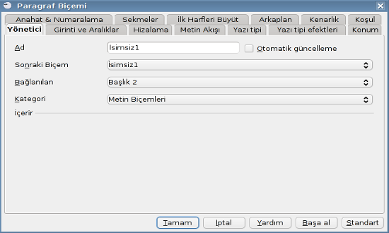 Paragraf Biçemi penceresinin "Yönetici" sekmesinde biçemin ismi tanımlanır.